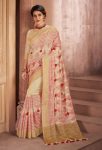 Cream Saree with Red Embroidery. Blouse : Plain Cream with golden border Blouse piece Colour : Cream / Red Material : Designer Cotton Silk