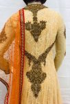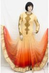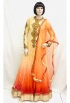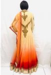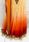 Ombre styled Long Salwar with embroidery, stone work and sequins embelishments comes with trousers and sequins worked net shawl. Material : Net/Lace Colour : Gold/Orange/Red