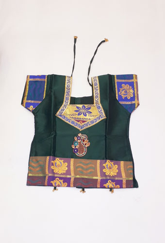Pattu pavada dark green/multicolour. Skirt in multicolour checks and dark green Pavada Top with border decoration on neck with half sleeves. Fits toddler size 22.