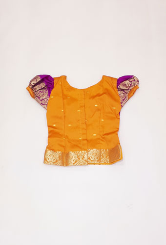 Pattu pavada mustard/purple. Skirt in purple and mustard Pavada Top with border decoration on neck with half puff sleeves. Fits toddler size 20.