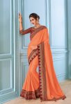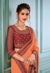 Plain Peach with Dark Red Border. Blouse : Contrast Dark Red with Gold embroidery Blouse piece Colour : Peach / Dark Red Material : Designer Raw Silk