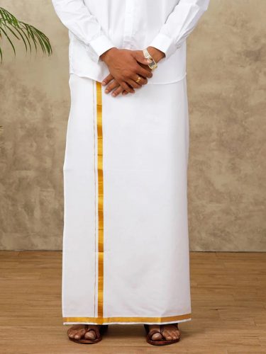 White Cotton Veshti/ Dhoti/ Mundu/ Panch Colour : White with Gold border Material : Cotton Size : Double / 8M