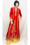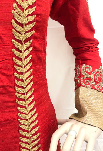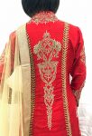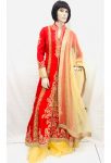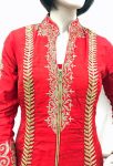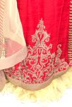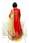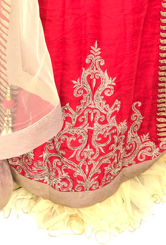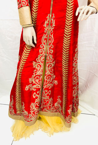 Skirt Suit with stone work and embroidery on top and net layered skirt, comes with net shawl. Material : Raw Silk/ Net Colour : Red/ Gold