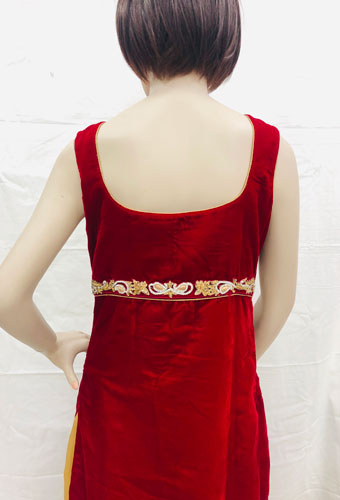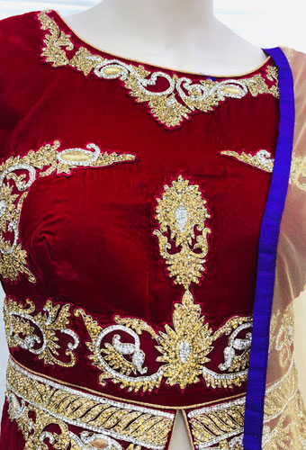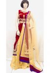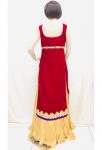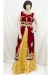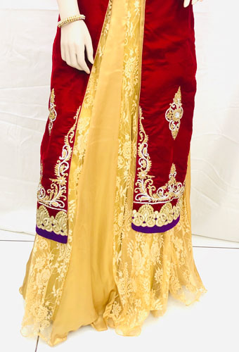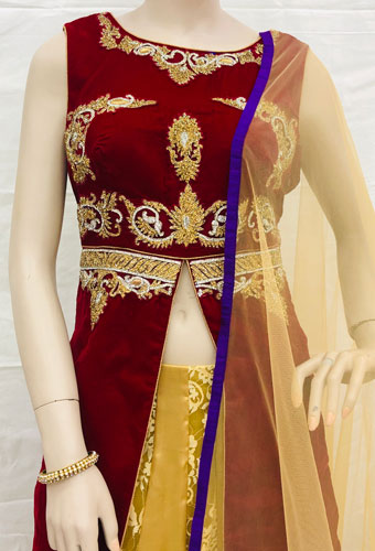 Skirt Suit with stone work and embroidery on top and net layered skirt, comes with net shawl. Material : Velvet/ Net Colour : Red/Gold