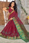 Dark Red Saree with Green/Gold Embroidery and Green with golden thread border.